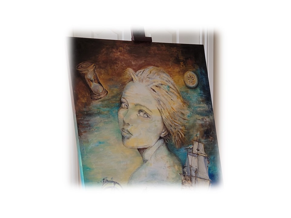 ‘Eternity’ is a big canvas, gallery scale, dwarfs even a big house. Painting ‘Eternity’ was an endeavor; my studio is small, I need a barn with my ambitions. Kneeling, bending, fretting into late nights, house taken over – it was infinitely satisfying talking to ‘Eternity’ as she emerged from the eternity…,symbols orbiting, seas and lands and skies colliding.