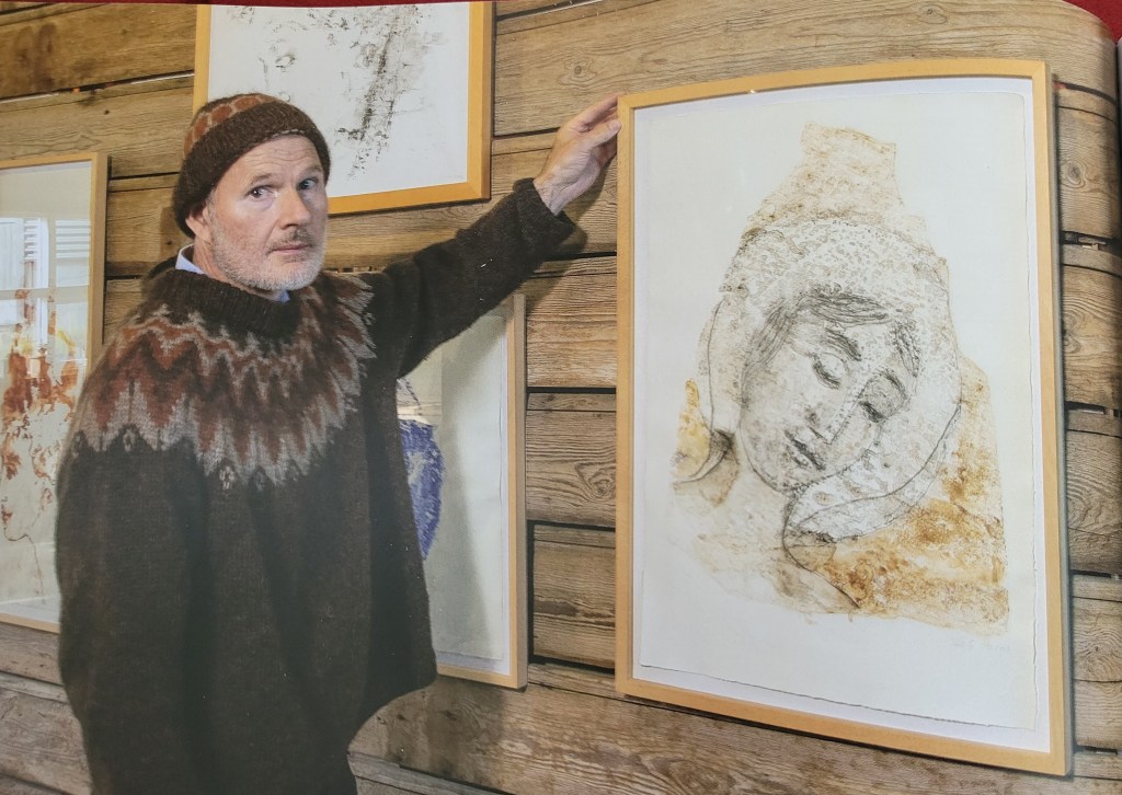 He is dressed in roughly knitted sweaters and tuques, rubber boots (no need for NY fashionable); his studio and gallery is a wooden cabin and whole of Iceland, his art emanates from the connection to its landscapes and its people, resigned to, and rejoicing nevertheless, in a lonely life. Contemplation and stories, stone shapes and sounds, imagination borne from the mist and ice and long northern nights.