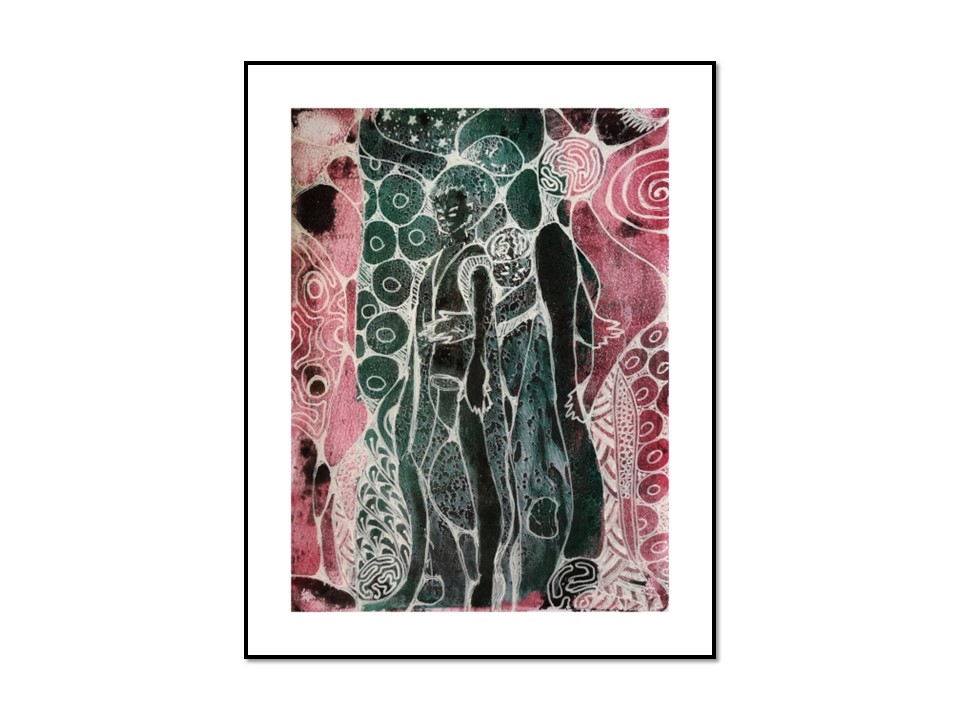 The series of mixed media works by Hung made on backgrounds of failed gel prints are creations not meant to be. Yet, they became foreceful imagery evoking associations of lands, faces, and shapes from cultures of different, distinct backgrounds.