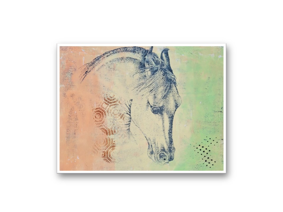 It was a cunning coincidence, as we were in the process of assembling a collection of gel transfer artworks from original drawings and images of women and horses…western, wild, of freedom and affection, of unrestrained movement, galloping as winds or resting in peaceful pastures. Elegance and strength, manes and dress(age). Truly, horses are so womanly! In her blood..in her care..in her untamed nature.